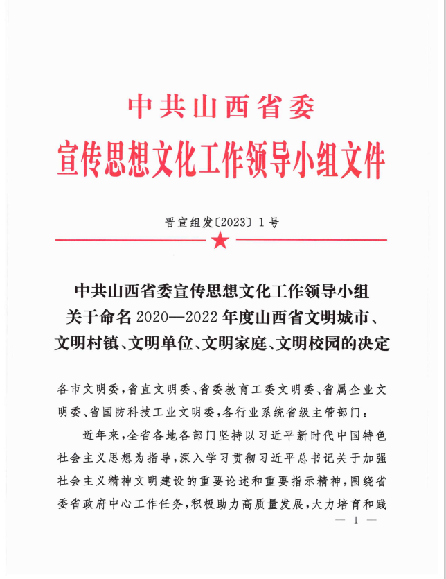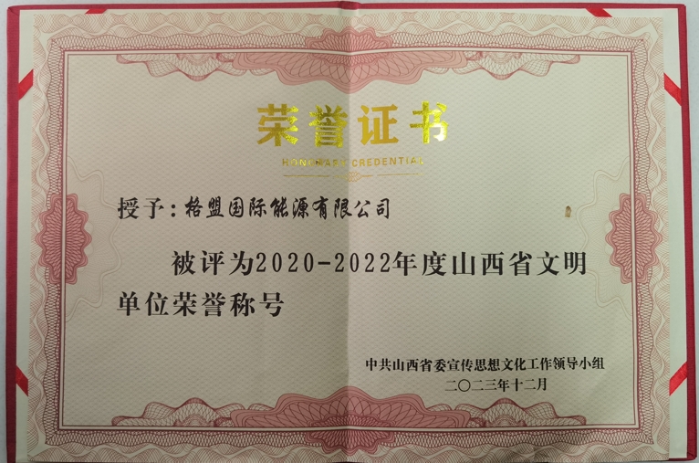 格盟國際能源有限公司被評為“2020-2022年度山西省文明單位”
